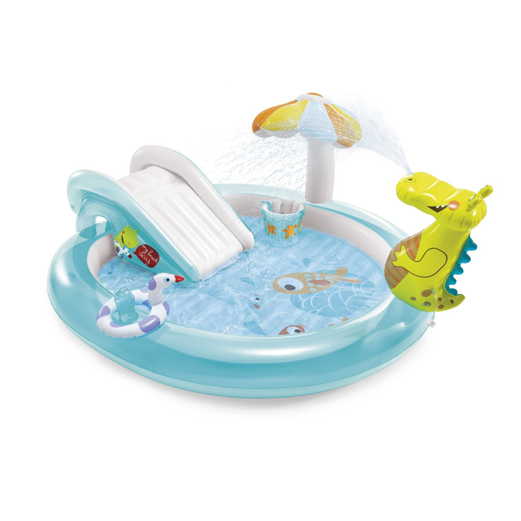 Het zwembadje heeft een paddenstoel als parasol, een glijbaan, emmer en een opblaasbare eend. Je kunt de tuinslang aansluiten aan de krokodil sproeier. Afmeting: 201 x 170 x 84 cm. Geschikt voor kinderen vanaf 2 jaar.